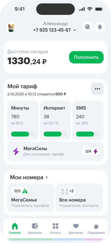 - 2Войдите в Личный кабинет и на главной нажмите на плитку «МегаСемья» в блоке «Мои номера».